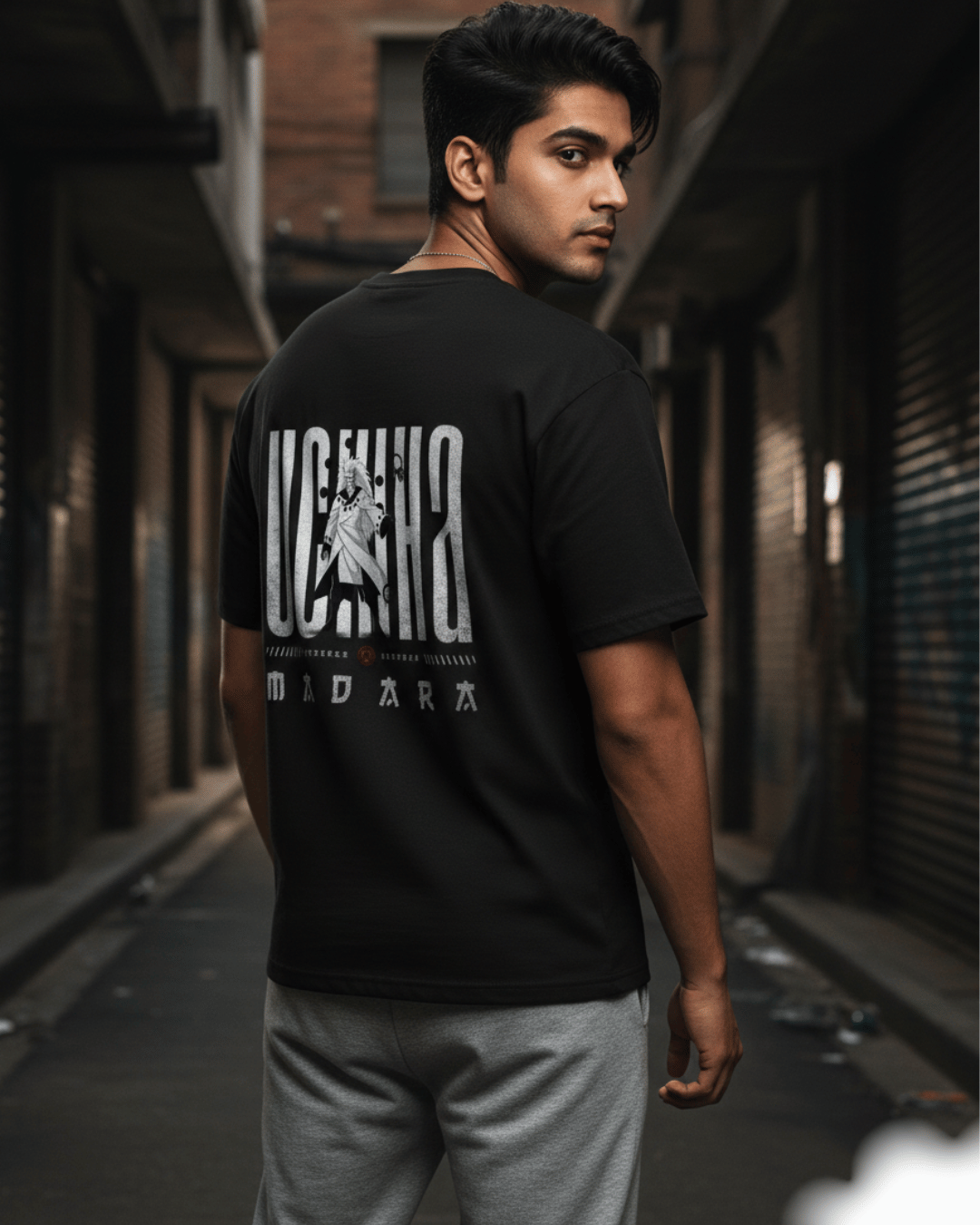 This oversized T-shirt features a commanding Madara Uchiha graphic, centered around dominance, ideology, and unmatched power. The bold vertical typography and monochrome palette amplify his presence, while subtle red accents add depth without breaking the restraint.